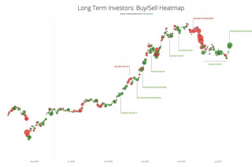 Las ventas más intensas del presente ciclo de bitcoin, se manifestaron en mayo, después de la caída del máximo histórico del 14 de abril. En junio y julio, predominaron las compras en los niveles mínimos de precio que ocurrieron antes del reciente repunte.
