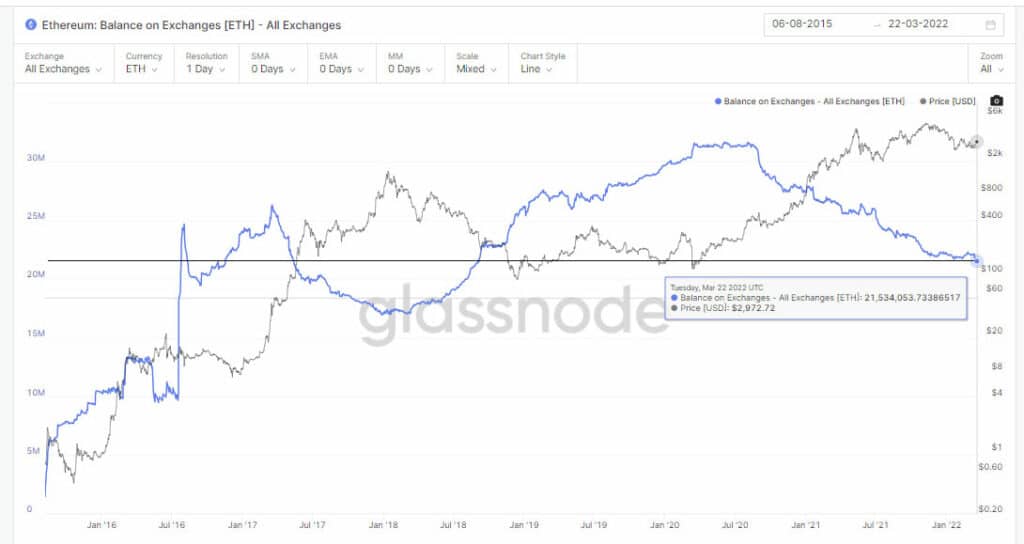 Al registrar un mínimo de 21,55 millones ETH este miércoles, las reservas de la criptomoneda de Ethereum bajaron a los niveles de septiembre de 2018. Respecto a inicios de 2022, hay 2,6% menos ETH en los exchanges, mientras que la disminución de los inventarios desde el máximo histórico de junio de 2020 es de 31,9%. En ese momento, las reservas de ETH alcanzaron los 31,38 millones, casi 10 millones más que los inventarios actuales.