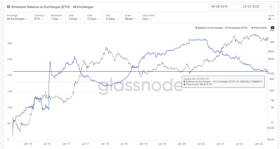 Unos 55.000 BTC han salido de los exchanges desde inicios de marzo, de acuerdo a la firma analítica Glassnode, mientras que las reservas de ETH han disminuido en 583.000 en el mismo período.
