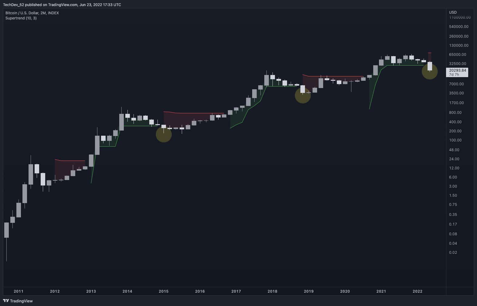 Generalmente, un análisis global del precio de bitcoin se hace con velas mensuales, con lo cual se eluden los movimientos interdiarios o semanales. En este gráfico se escogen velas de dos meses, lo que permite apreciar las tendencias del precio de bitcoin, aunque poniendo un poco de lado la alta variabilidad de escalas de tiempo menores.