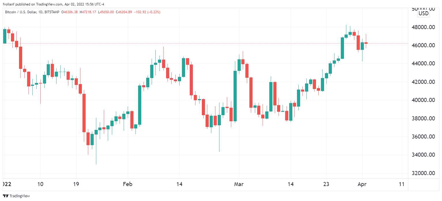 El retroceso en el precio ocurrió justamente horas antes del cierre del primer trimestre, que culminó en cifras rojas, tal como lo reportamos en este medio, aunque las pérdidas del período estuvieron por debajo del 2%. En el contexto de la corrección que se inició después del 10 de noviembre de 2021, el precio de bitcoin tocó fondo el pasado 24 de enero en las cercanías de los USD 32.000. Desde entonces, sin embargo, el precio ha mantenido una tendencia creciente, con mínimos cada vez más altos.