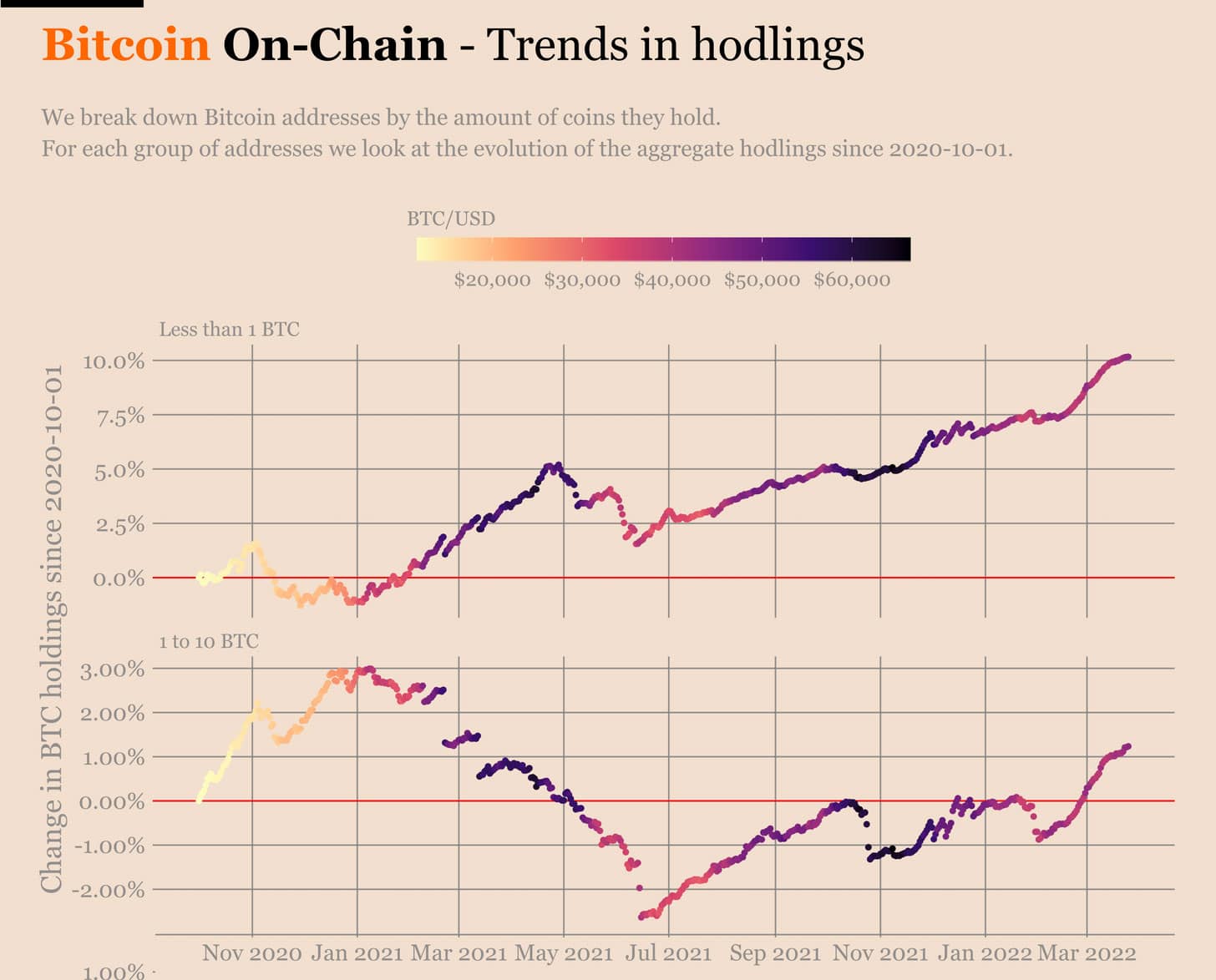 Entre los indicadores que soportan el auge del precio de bitcoin, destaca la acumulación de bitcoin por parte de los pequeños inversionistas, de acuerdo a un reporte de Ecoinometrics, comentado por CriptoNoticias. Especialmente, el reporte alude a los holders que controlan direcciones con balance menor a 1 BTC, así como el grupo de inversionistas con balance entre 1 BTC y 10 BTC, son los que muestran mayor crecimiento en sus tenencias.