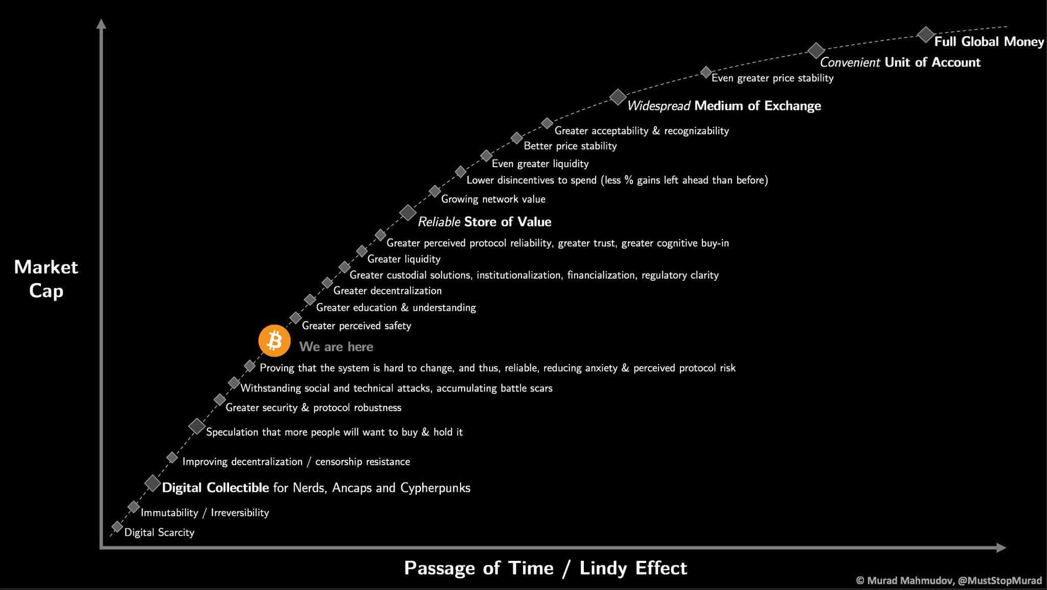 La robustez de Bitcoin, así como su seguridad, ya están reconocidas. Pero necesita ser percibido por la mayoría de las personas como seguro, para lo cual deben desplegarse más campañas de formación y educación en torno a este. Requiere aumentar su liquidez, pues su capitalización de mercado es todavía pequeña frente a las grandes corporaciones. Estos requisitos son necesarios para que bitcoin pueda alcanzar reconocimiento como reserva de valor.