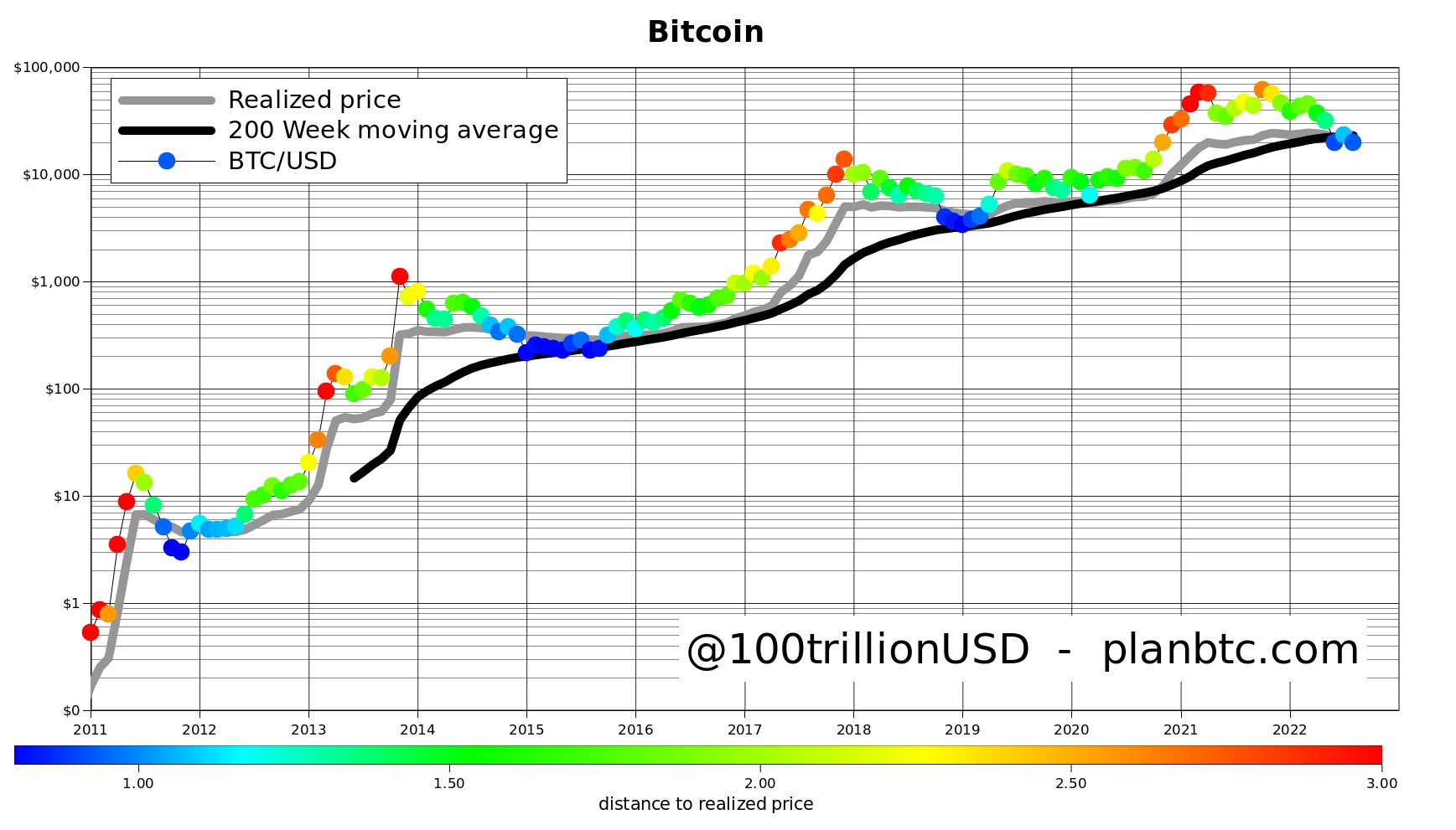 El analista PlanB destaca que el hecho de que el precio de BTC y el precio realizado, están por debajo por debajo de la media móvil de 200 semanas, lo que estaría sugiriendo que los usuarios de bitcoin de «manos débiles» (aquellos con más disposición a vender) ya han vendido.