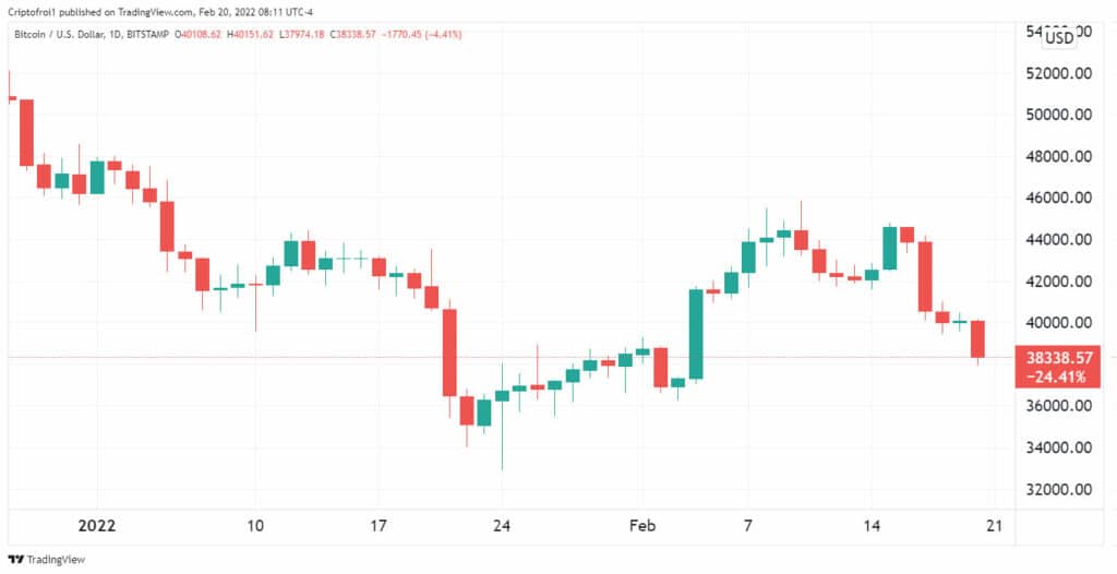 Después de un repunte prometedor del precio de bitcoin en las dos primeras semanas de febrero, la intensificación de las tensiones entre Rusia y Ucrania provocaron un declive sostenido en la cotización de BTC. Desde el miércoles pasado vienen en retroceso tanto la cotización de bitcoin, como la de los principales índices de acciones tradicionales.