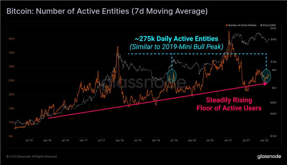 El número de entidades activas diarias de la red de Bitcoin han servido como un indicador de la actividad de la red. También, los máximos de esta métrica han coincidido o se han anticipado a los máximos locales o a los topes históricos del precio. En diciembre de 2017, en coincidencia con un máximo histórico, se superaron las 350.000 entidades activas diarias. En enero de 2021, en plena corrida alcista, y sin coincidir con un máximo histórico del precio, se produjo el récord de esta métrica, más de 400.000 entidades activas diarias.