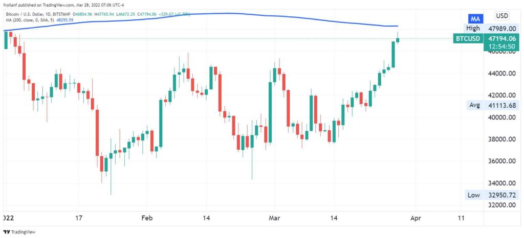 El rally de bitcoin de las últimas dos semanas y la ruptura temporal de la resistencia de USD 45.000, reportada por CriptoNoticias este viernes 25 de marzo, apuntan a nuevas metas. Si bien el precio retrocedió en pocas horas para situarse este sábado 26 en las cercanías de los USD 44.500, este domingo se registró un repunte adicional que lo posiciona muy cerca de los USD 48.000, el nivel de inicios de año.