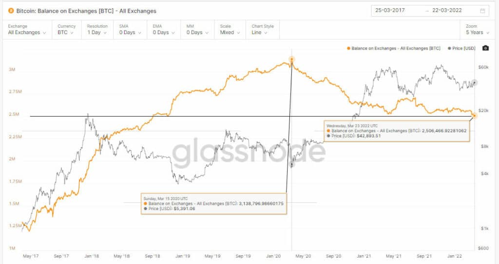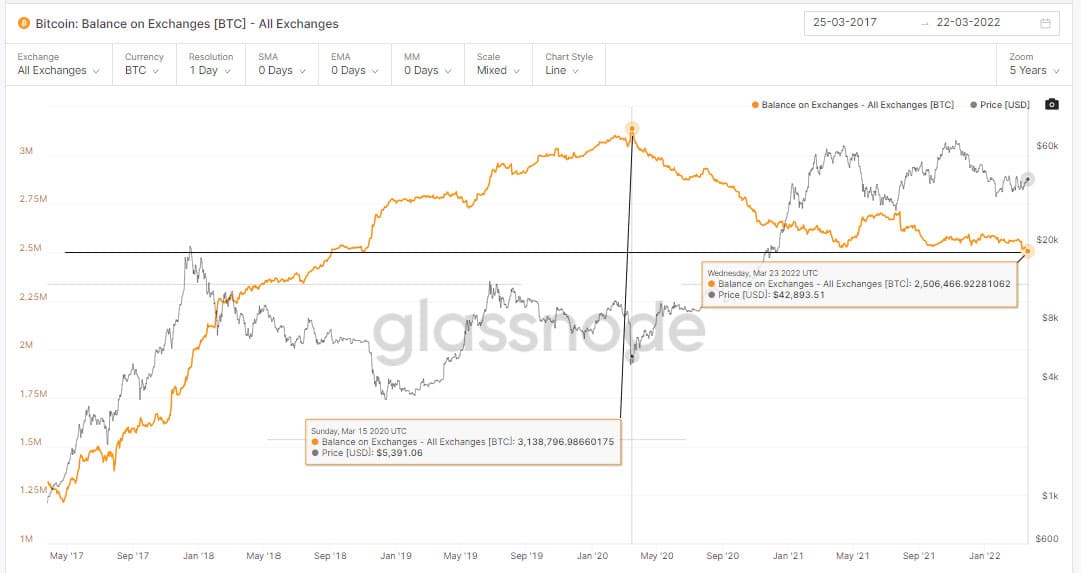 Las reservas de bitcoin en los exchanges registraron un máximo de 3,14 millones en marzo de 2020 y se han reducido a 2,5 millones de BTC, lo que representa un 20,14% de reducción.