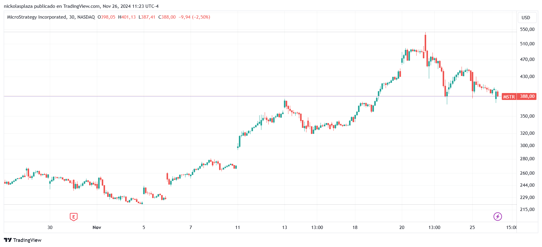Por su parte, el precio de las acciones de MSTR alcanzaron su máximo histórico el jueves de la semana pasada cuando llegó a 544 dólares por acción. En la jornada actual el precio ha descendido a 398 dólares, tal como se aprecia en el gráfico de TradingView.