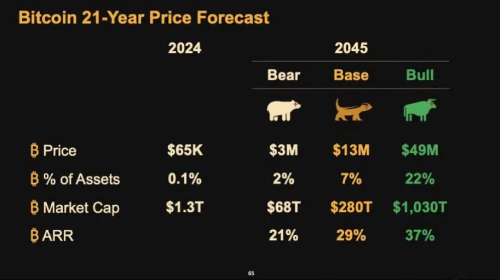 Según el empresario, el precio de bitcoin podría oscilar entre tres escenarios hipotéticos: un caso bajista con un precio de 3 millones de dólares por moneda, un caso base de13 millones de dólares, y uno alcista que llevaría a BTC a alcanzar los 49 millones de dólares, hecho reportado por CriptoNoticias.