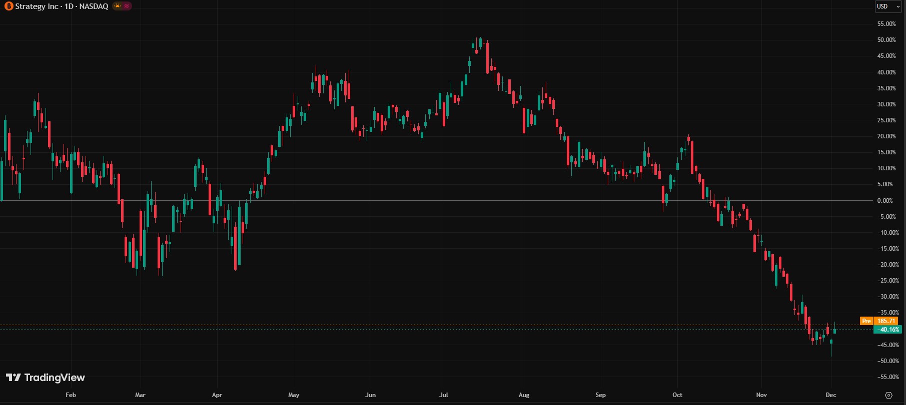 Hay que tomar en cuenta que las acciones de Strategy han caído en un 40% este año, tal como se ve en la siguiente gráfica. Una situación que se exacerbaría si finalmente la compañía es deslistada del MSCI.