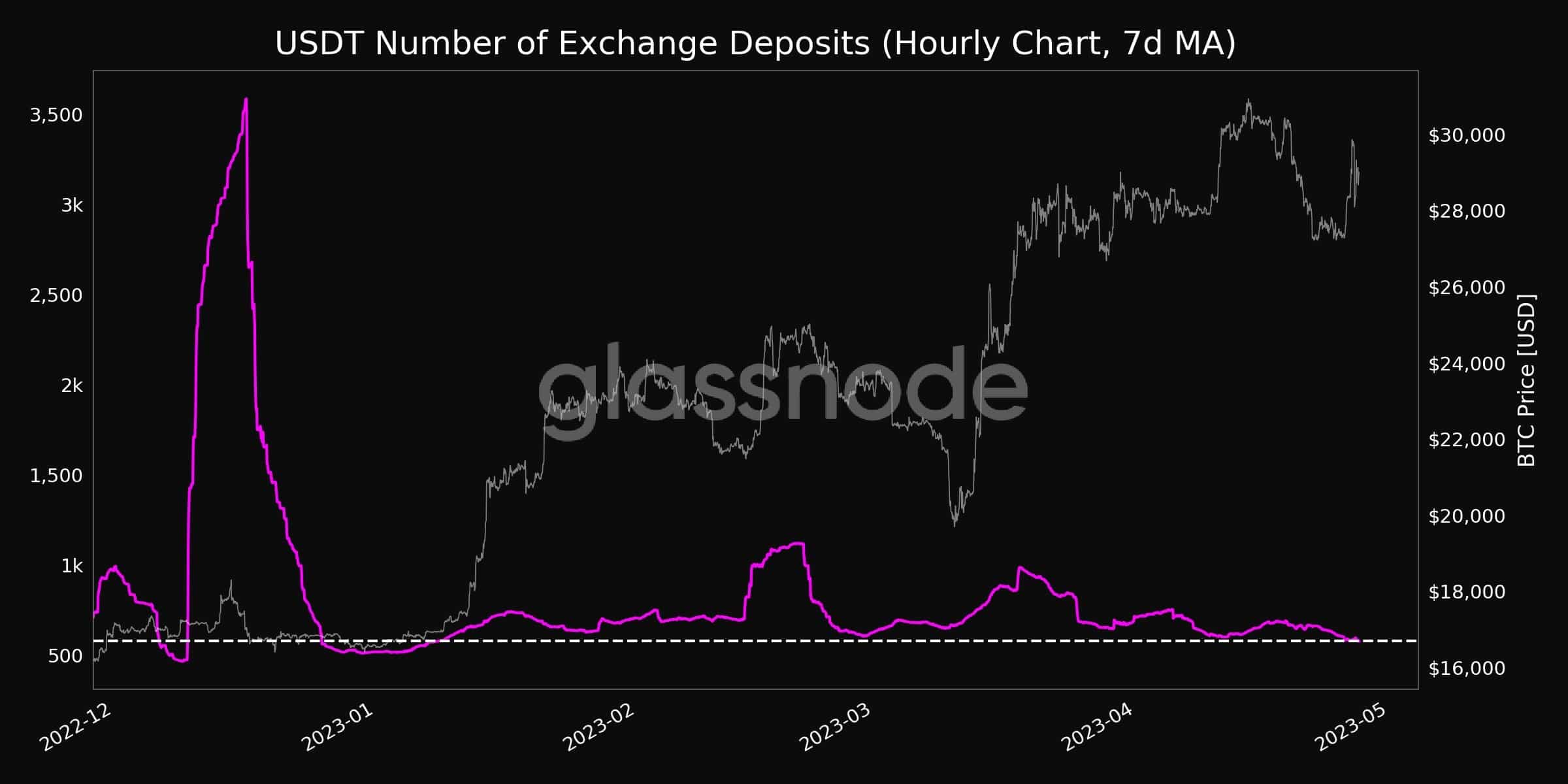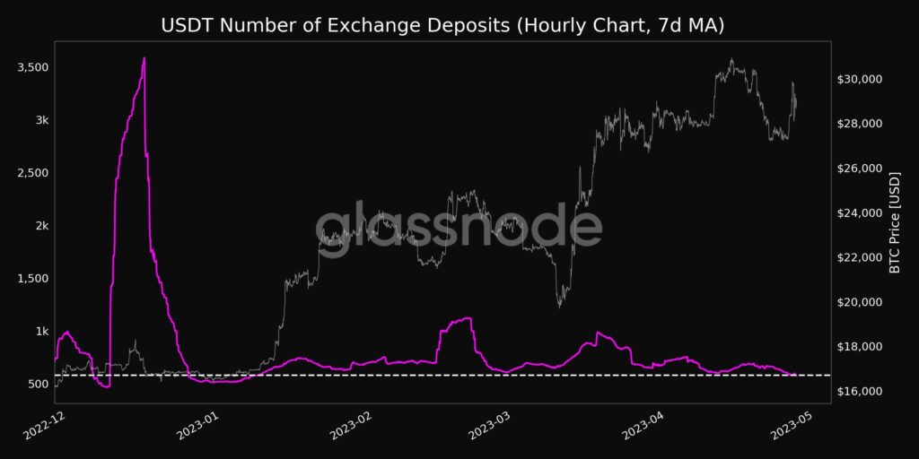 Se trata de la cantidad de depósitos de la stablecoin tether (USDT) en exchanges, que cayó a 579.536 (promedio de 7 días), su mínimo en 3 meses desde enero. Así lo detectó el explorador de datos Glassnode como exhibe el siguiente gráfico.