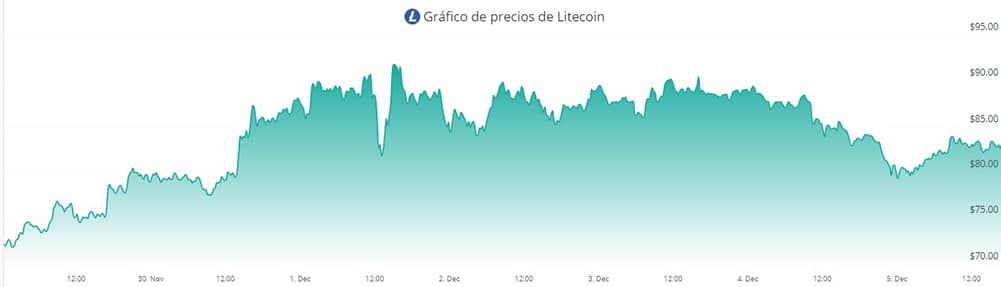 El precio de LTC alcanzó un pico de 91,8 dólares el 1 de diciembre. A pesar de registrar un descenso el día 5 de este mes, en las últimas horas se observa un nuevo movimiento alcista. La capitalización de mercado es de USD 5.480 millones y el volumen de comercio diario es de 5.560 millones de dólares.
