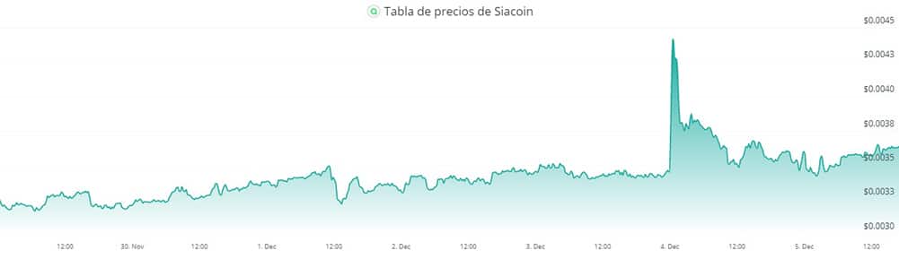 El valor de SC llegó a un pico de USD 0,0044 el 4 de diciembre. Aunque se registra una ligera caída ese mismo día, el ascenso se sostiene a la fecha y, a pesar de ligeras correcciones, el precio asciende en más de 2,4% en las últimas 24 horas.
