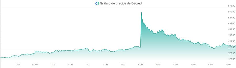 Simultáneamente, la criptomoneda DCR se ha estado moviendo en estos siete días entre un mínimo de USD 21,82 el 28 de noviembre, y un máximo de USD 40,09 el 3