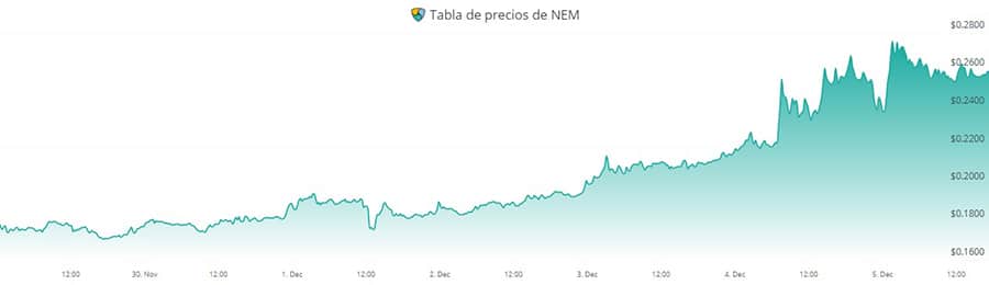 Esta semana NEM Group reveló que, para este 7 de diciembre, pondrá en marcha una plataforma para vincular su activo ERC-20 ya existente (Wrapped XEM). El plan es que sirva de puente con la blockchain de Ethereum. En el marco de la difusión de esta información XEM comenzó a subir significativamente desde el 4 de diciembre. Su alza se estima en 39,6%.