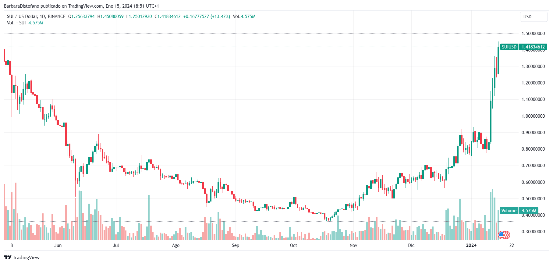 La cotización de la criptomoneda pasó de 0,84 dólares a 1,40 dólares durante la jornada actual. Este incremento coloca a SUI en sus precios máximos de la historia, como lo exhibe el siguiente gráfico de TradingView.