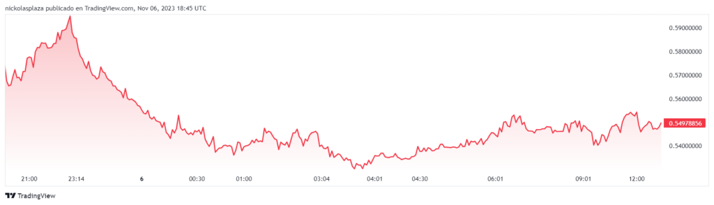 CELO comenzó la jornada de hoy con un precio de USD 0,594 y actualmente tiene una cotización de USD 0,549, esto representa una caída de 4% en 24 horas.