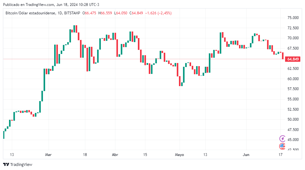 La cotización de bitcoin (BTC) entró en un período de lateralización que ya lleva tres meses, tras alcanzar su máximo histórico (ATH) de 73.700 dólares en marzo. Desde ese momento, la moneda digital experimentó subidas y bajadas y su precio actual es de 64.800 dólares.