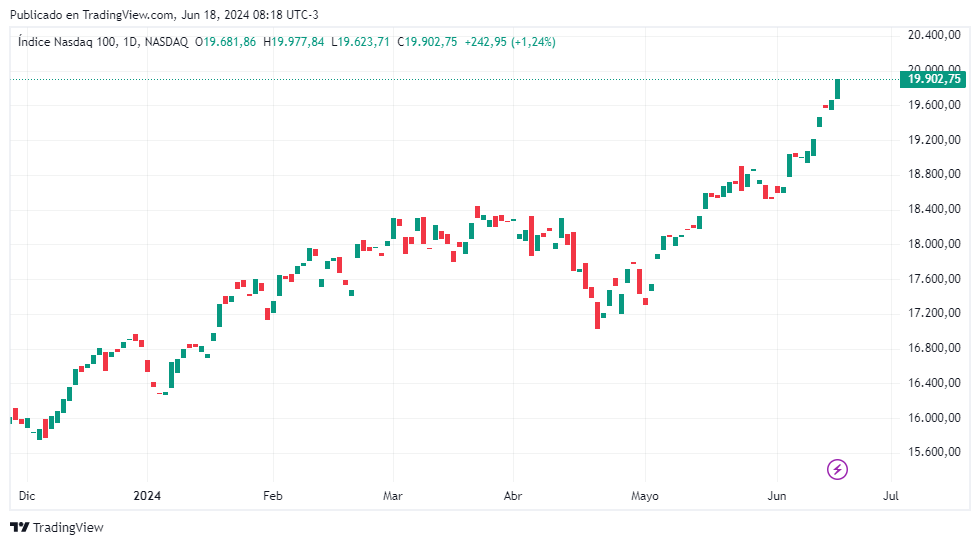 Todo esto ocurre mientras el índice NASDAQ, que aglomera a las principales empresas del sector tecnológico, sigue marcando ATH en su cotización, tal como se ve en el gráfico. Estas acciones que componen el índice son consideradas activos de riesgo, al igual que BTC, pero en las últimas dos semanas no hubo correlación entre ambas.