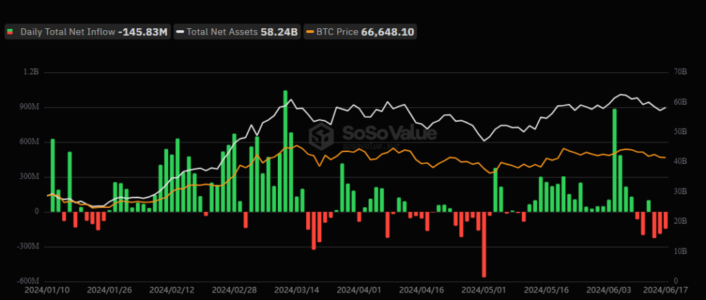 Este lunes, los ETF registraron salidas netas por 145 millones dólares. Según datos de SosoValue, FBTC de Fidelity, que perdió 92 millones de dólares, seguido por Ark Invest y ARKB de 21Shares con 50 millones de dólares, mientras que GBTC de Grayscale y HODL de VanEck también registraron flujos negativos de alrededor de 4 millones de dólares.