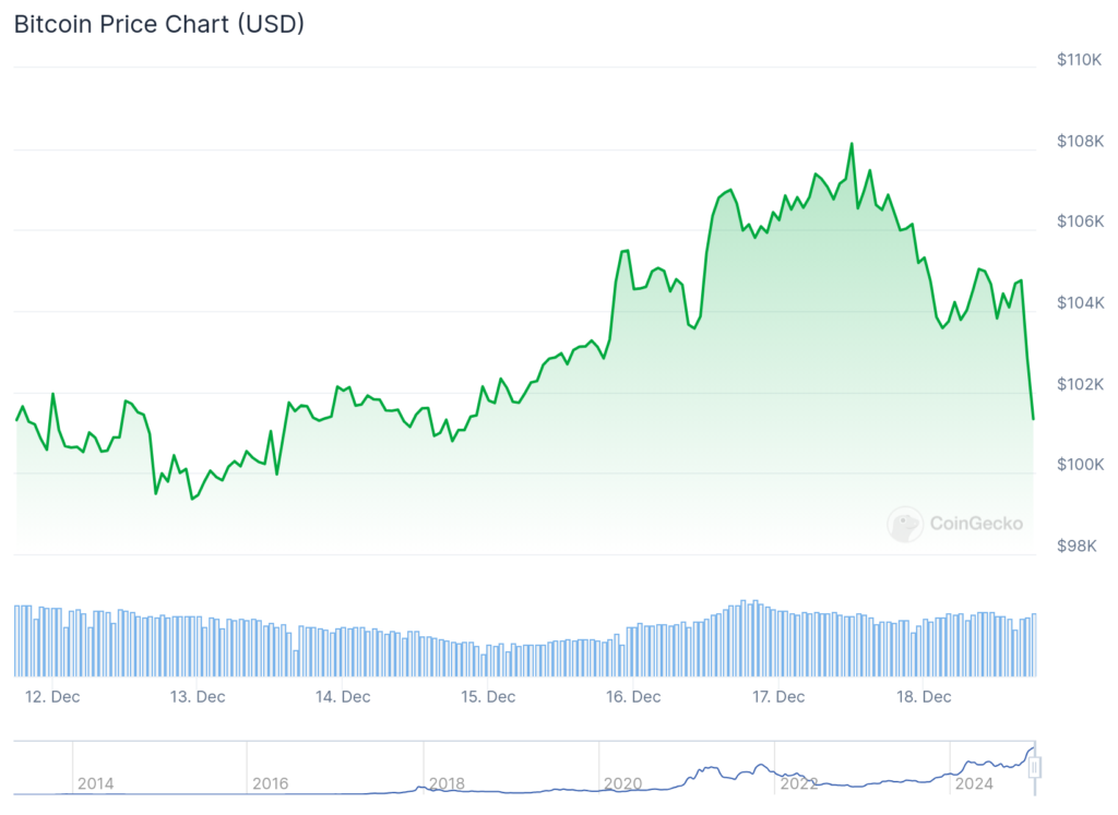 Hace tan solo unas horas, bitcoin (BTC) parecía predestinado a alcanzar los 110.000 dólares. Pero en la tarde de hoy, 18 de diciembre, su precio se acerca a los 100.000 dólares.