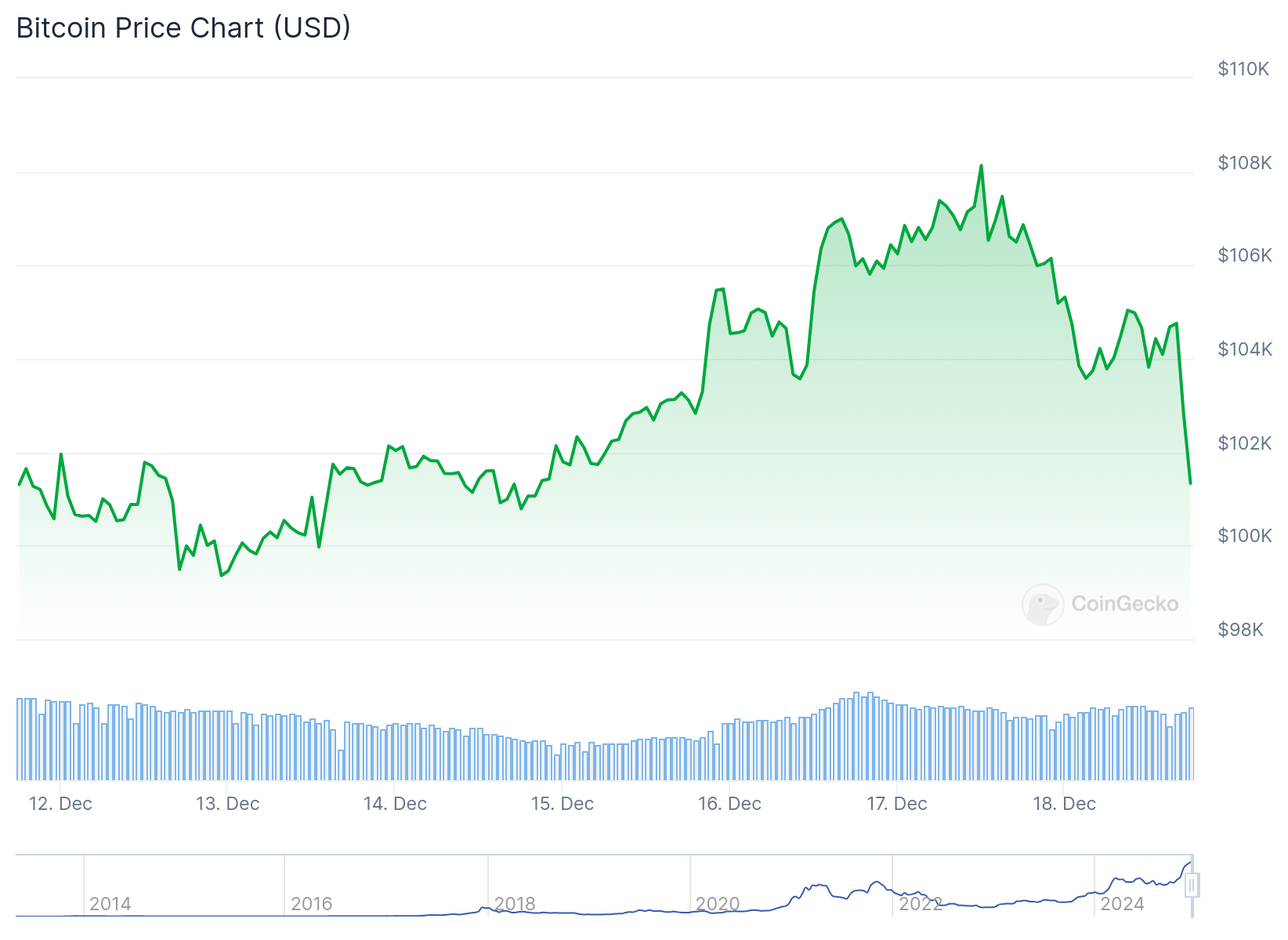 Hace tan solo unas horas, bitcoin (BTC) parecía predestinado a alcanzar los 110.000 dólares. Pero en la tarde de hoy, 18 de diciembre, su precio se acerca a los 100.000 dólares.