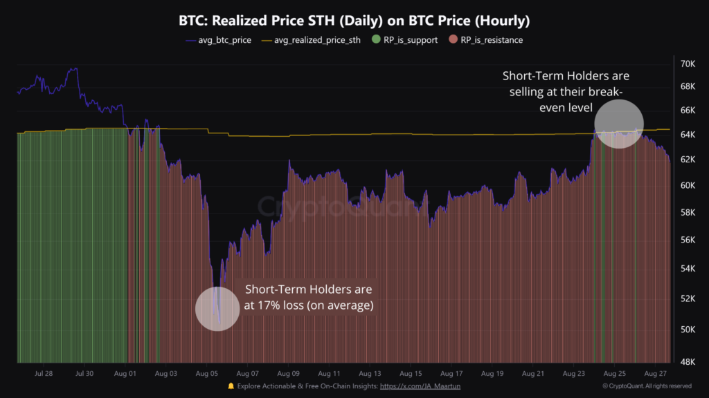 Como se ve a continuación, a principios de agosto, cuando el precio de bitcoin experimentó una fuerte caída, la tenencia media de los STH se situó en una pérdida del 17%. Pero, con la subida luego, el precio del mercado volvió a estar en su costo base promedio, lo que les permitió vender cerca del punto de equilibrio, señala CryptoQuant.