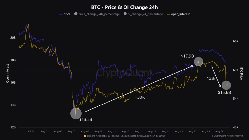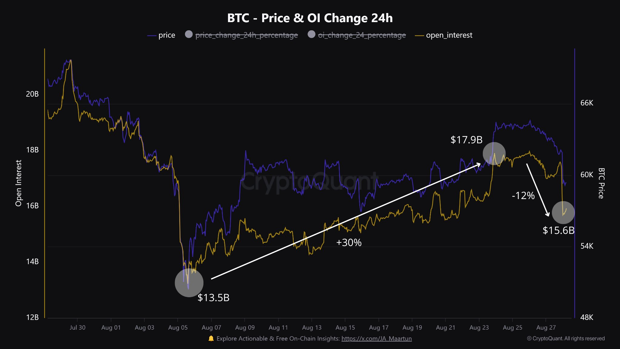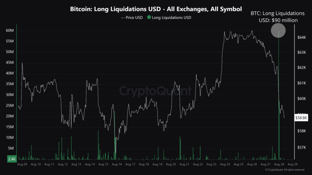 La caída de bitcoin (BTC) en los últimos dos días desde casi 65.000 hasta 58.000 dólares (USD) refleja una debilidad del mercado que puede verse exhibida en 5 métricas. Así lo resume la plataforma de análisis on-chain, CryptoQuant, en un análisis publicado en la red social X el 28 de agosto.