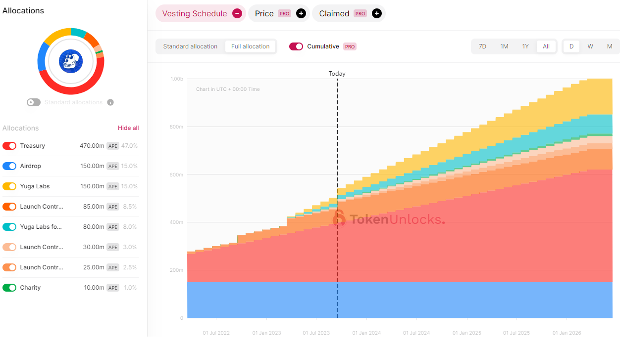 No solo el desinterés por los tokens coleccionables es responsable de la caída del token ApeCoin. Otro motivo que lleva a la baja a APE es el inminente desbloqueo de 40 millones de estos tokens por parte de los desarrolladores, de acuerdo al explorador TokenUnlocks.