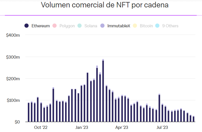 Bored Ape Yatch Club no es un caso aislado. En términos generales, el volumen de trading de NFT está en mínimos, luego de la “NFT-manía” de 2021-2022. En la siguiente imagen se observa la evolución de este volumen en la red Ethereum, que es donde “vive” la colección Bored Ape Yatch Club.