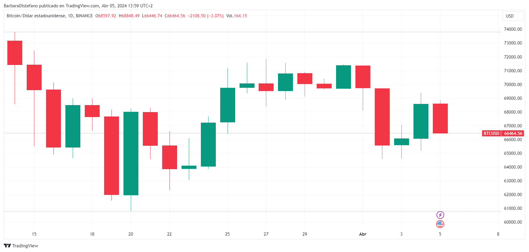 Este panorama toma lugar mientras bitcoin cotiza desde hace tres semanas mayormente entre los USD 65.000 y USD 70.000. Como exhibe el siguiente gráfico, esto ocurre luego de que tocara los USD 73.700, su nuevo máximo histórico hasta el momento, lo que evidenció que la moneda se encontraba en su cuarto ciclo alcista.