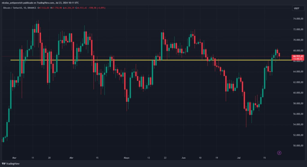 Bitcoin (BTC) se mantiene por arriba de los 66.000 dólares, que es una resistencia clave si quiere conservar la tendencia alcista que tomó en los últimos días.