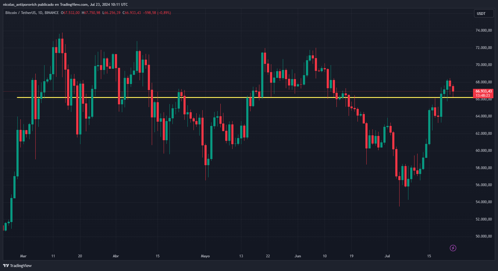 En el siguiente gráfico, provisto por TradingView, se observa que en varias ocasiones desde marzo, BTC ha rondado en torno a esta zona de precios: