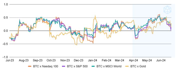 A raíz de estos ingresos de dinero, se desprende que la correlación entre BTC y el mercado financiero tradicional ha disminuido durante el segundo trimestre de 2024.