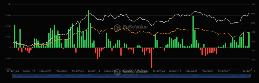 De todos modos, esta potencial presión de venta ha sido absorbida en los últimos días por los ETF de bitcoin que cotizan en el mercado estadounidense. Tal como puede verse en el siguiente gráfico, elaborado por la plataforma SoSoValue, ayer tuvieron un día de flujo de capital positivo, que llegó a superar los 400 millones de dólares. Ya van 11 días en verde para los ETF de bitcoin.