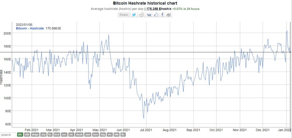 Como muestra de que los coletazos de la desconexión de nodos en Kazajistán siguen teniendo impacto, la tasa de hash de Bitcoin se mantiene a la baja. Para el 6 de enero, el hash rate estaba en 170,8 EH/s y se mantiene en esos valores.