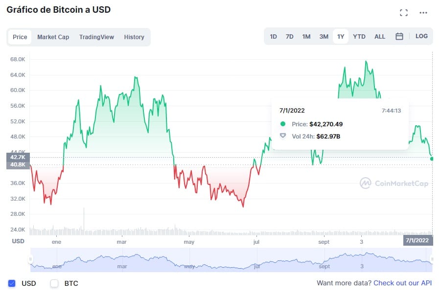 De acuerdo con la data de CoinMarketCap, la primera criptomoneda del mercado tiene un precio promedio de USD 42.255, que representa una baja de 1,29% respecto al día anterior, cuando cotizaba en USD 42.800.
