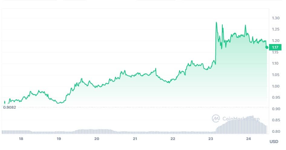 El precio de la criptomoneda KAVA pasó de USD 0,90 a USD 1,28 en los últimos siete días, mostrando así un aumento de más de 30%. Y, aunque luego se desinfló ligeramente hasta USD 1,17, es el criptoactivo del top 100 de capitalización que más se apreció en dicho periodo.