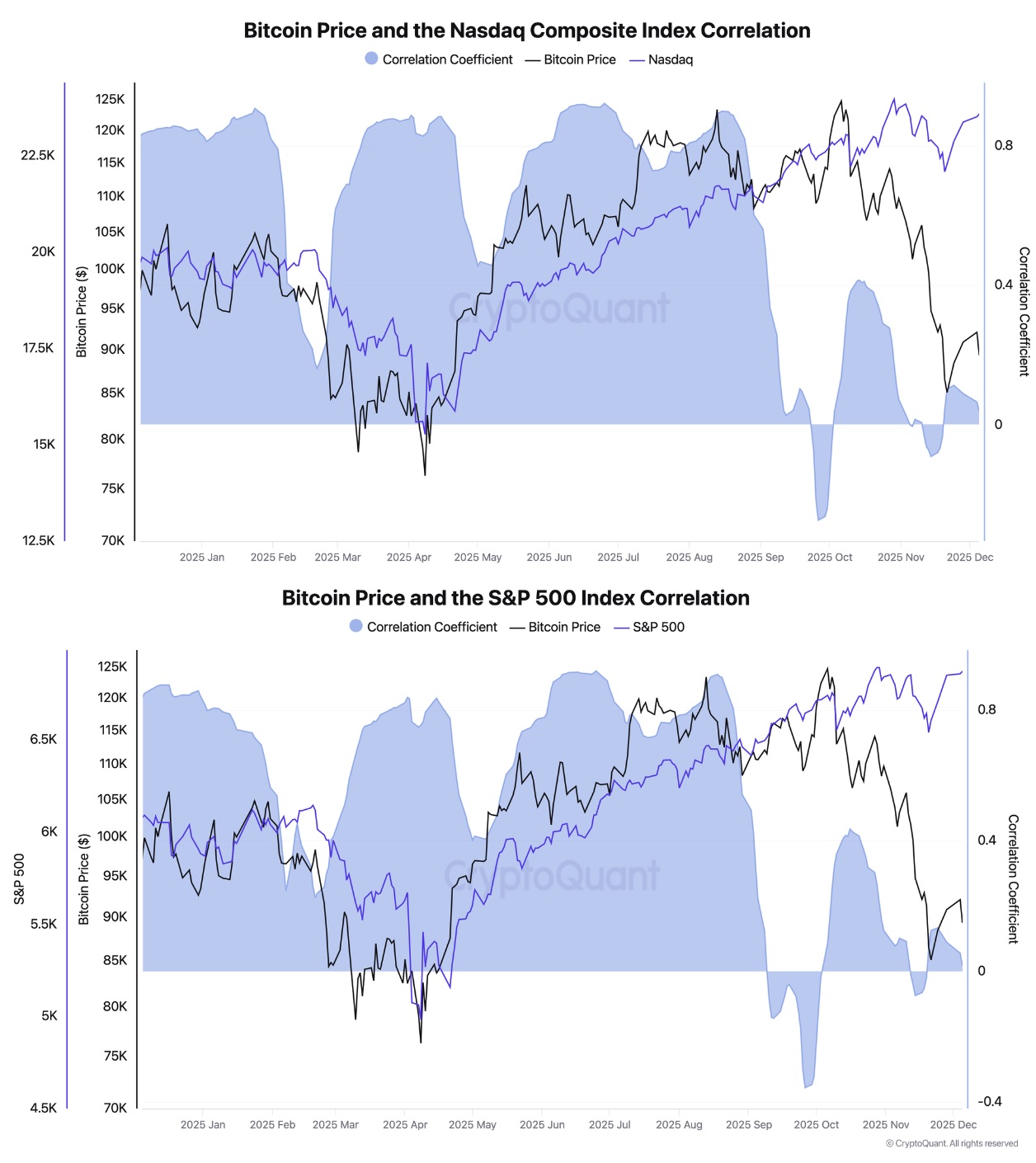 El desacople también se evidencia en los datos on-chain. Según un análisis elaborado por el analista de la comunidad de CryptoQuant conocido como “Darkfost”, el coeficiente de correlación entre bitcoin y los principales índices bursátiles se encuentra en mínimos anuales.
