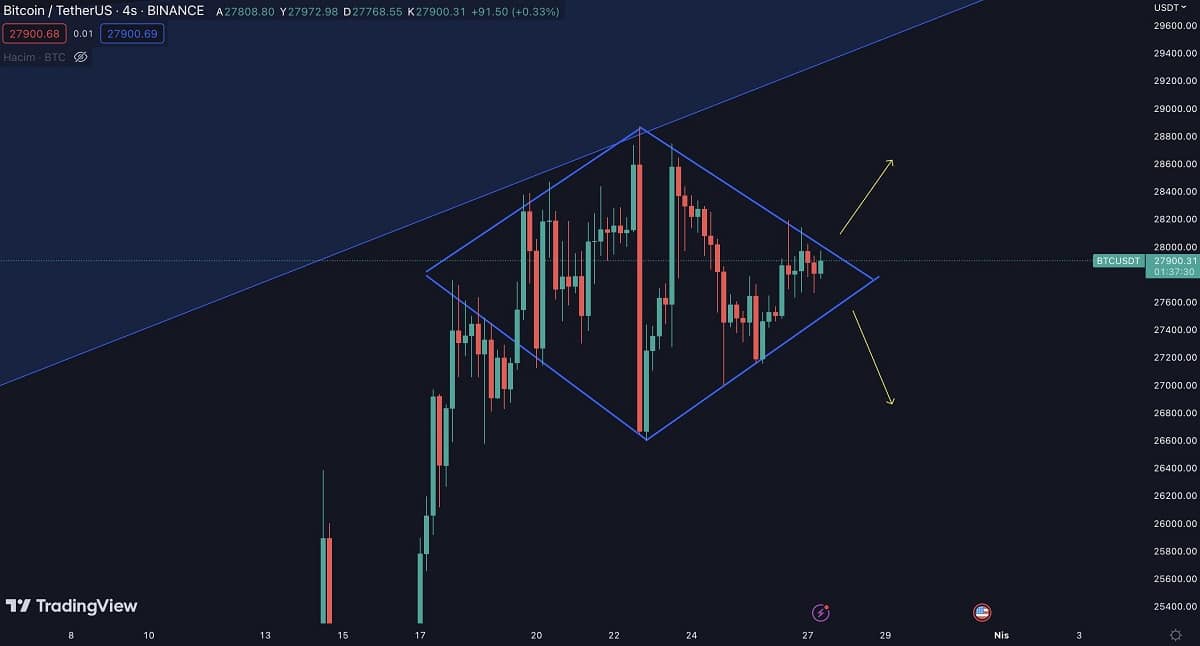 El analista KriptoBurjuva comunicó que se está formando un diamante en el comportamiento de precio de bitcoin como se ve en el gráfico. Ante ello, señaló que si hay un quiebre en la parte superior, apuntará a los USD 31.380. Pero en caso de que haya una ruptura del fondo, piensa que irá a USD 24.182.