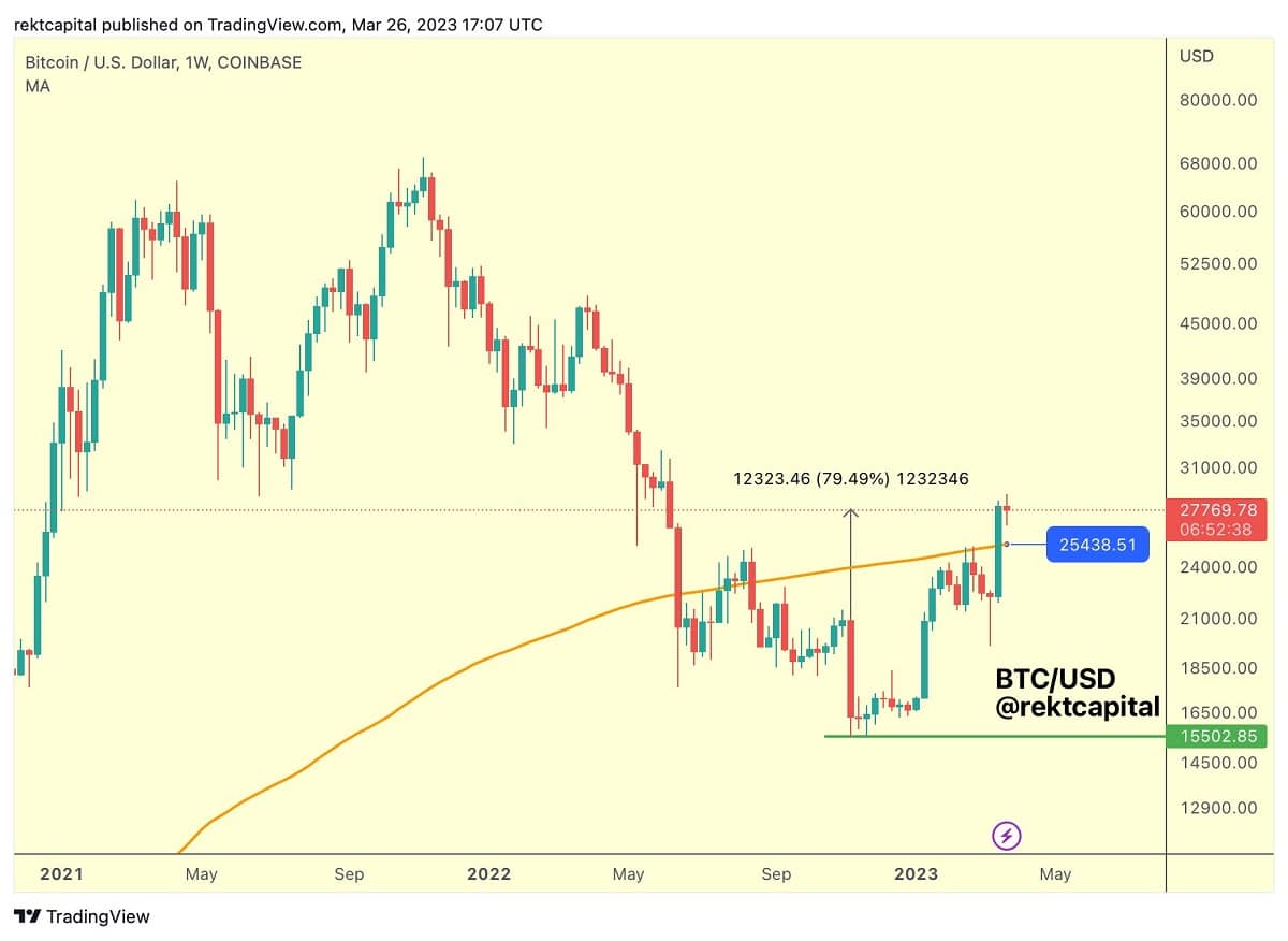 Rekt Capital cree que, si bitcoin cae, podría probar soporte en la media móvil de 200 días que se encuentra en los USD 25.400. Sin embargo, señaló que puede que pronto aparezca un evento que elimine la debilidad actual del mercado para continuar con la tendencia alcista.
