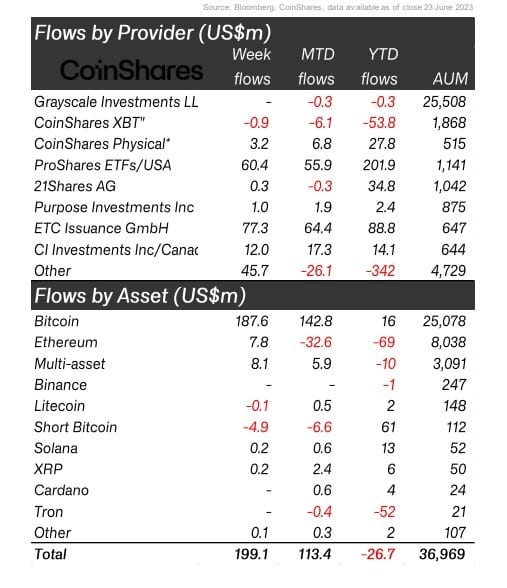 “Creemos que este sentimiento positivo renovado se debe a los anuncios recientes de emisores de productos negociados en bolsa (ETP) de alto perfil que han solicitado fondos cotizados en bolsa (ETF) con respaldo físico ante la Comisión de Bolsa y Valores de Estados Unidos (SEC)”, resaltó CoinShares.