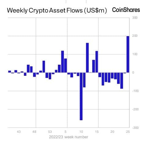 Las entradas de dinero en productos de inversión en activos digitales aumentaron en la última semana a su máximo en casi un año. Estas fueron de un total de 199 millones de dólares (USD), las mayores desde julio de 2022, gracias a la atracción que generó bitcoin (BTC), según la empresa de análisis y servicios de inversiones CoinShares.