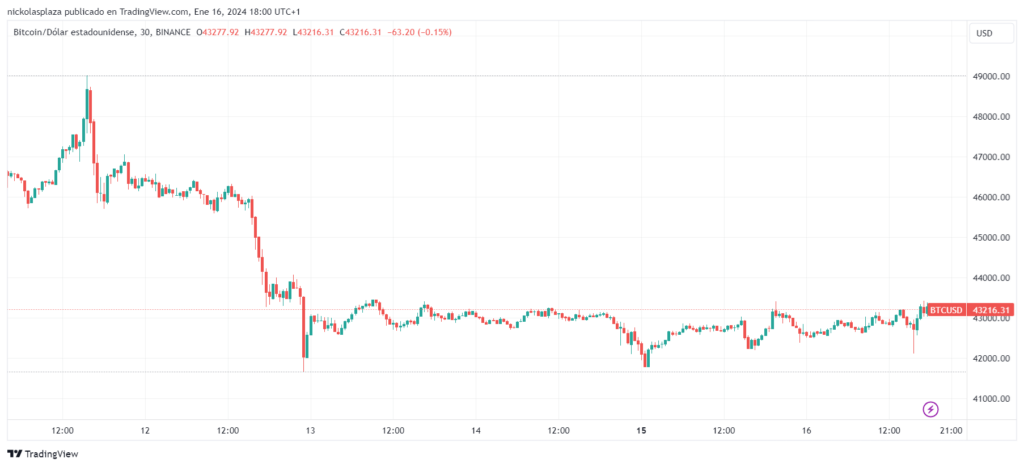 Esto — según el informe de Kaiko — hizo que el precio de la moneda digital, que alcanzó los 49.000 dólares un día después de que se aprobaran los 11 ETF de bitcoin, descendiera luego a los 41.500 dólares. Desde ese momento, el precio de BTC ha estado lateralizando y actualmente se ubica en los 43.000 dólares, como se aprecia en el gráfico de TradingView.