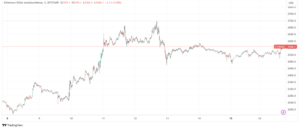 Al momento de su salida en la bolsa, el precio de ETH llegó a 2.700 dólares, actualmente se encuentra en 2.568 dólares. Su precio en los últimos siete días tuvo un incremento de 13%, como lo muestra el siguiente gráfico de TradingView.