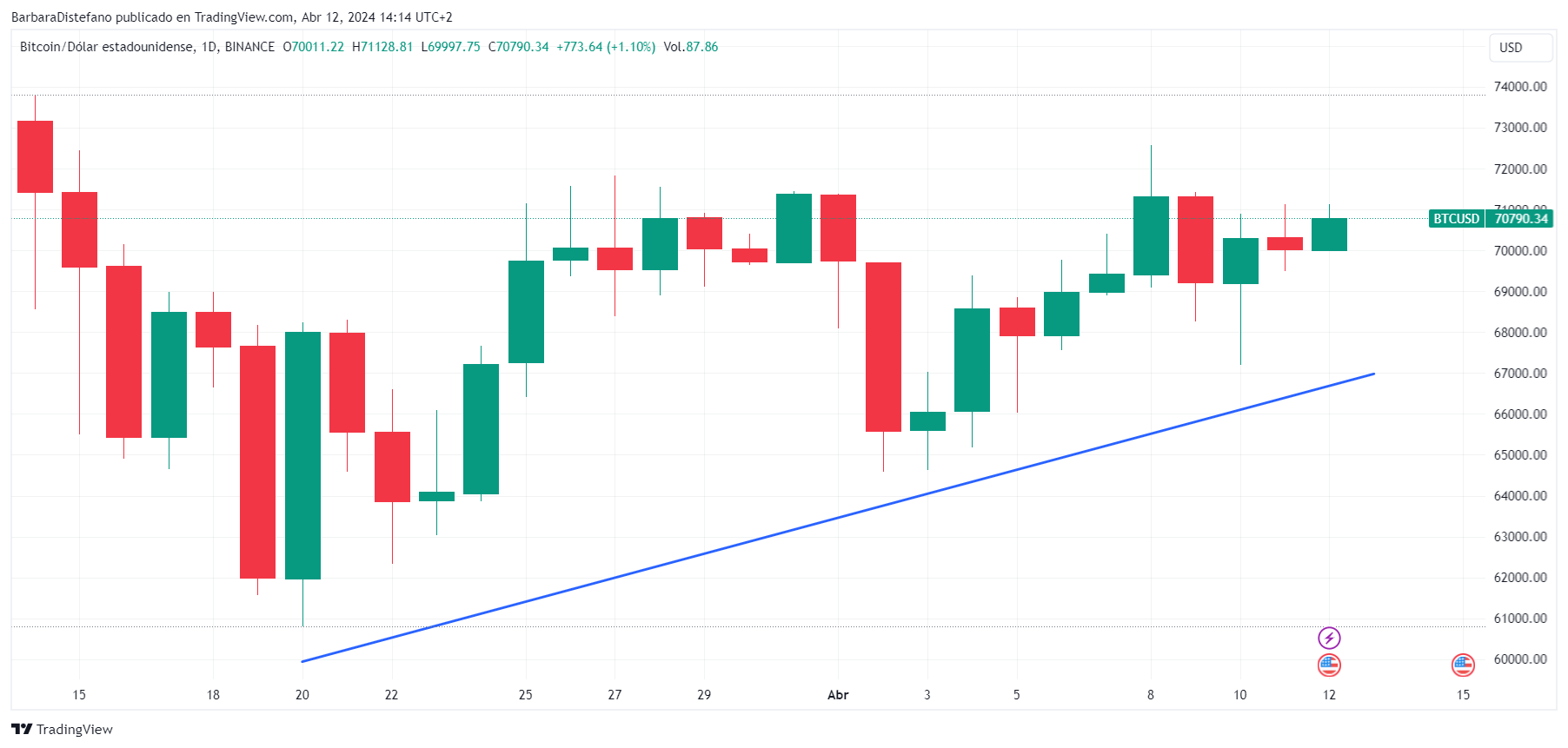 De acuerdo al análisis técnico, esta tendencia ascendente de bitcoin refleja que, si no se pierde, el mercado romperá próximamente el precio máximo histórico de USD 73.700 registrado hace un mes.