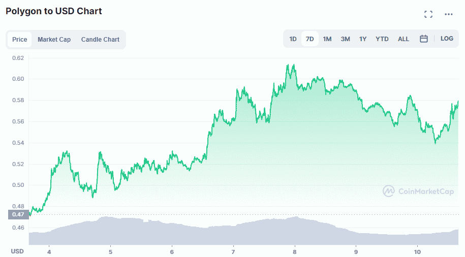 En efecto, al momento de redacción de este artículo MATIC muestra un incremento de 22,42% en ese rango semanal. La subida porcentual se traduce en el paso de USD 0,47 a USD 0,57, como muestran los registros de CoinMarketCap.