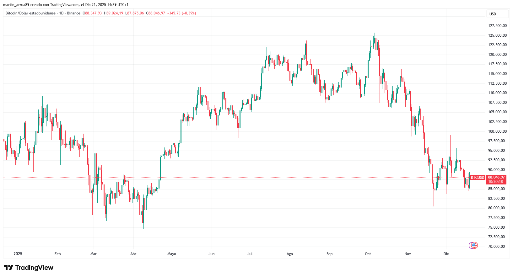 Al momento de la publicación de esta nota, el precio de bitcoin es de 88.000 dólares, un 30% por debajo de su máximo histórico (ATH) de 126.100 dólares: