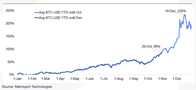 El siguiente gráfico de Matrixport, muestra el crecimiento porcentual del precio de bitcoin desde el 1 de enero de 2023 hasta lo que sería su comportamiento el próximo mes de diciembre, de acuerdo a su análisis. La imagen detalla que el precio de bitcoin creció 86% en octubre y para para el 18 de diciembre ese aumento sería de 235%.
